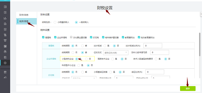 1、对于满足小型微利企业条件的企业,先登录好会计/易代账,进【设置-财税设置】,在【税务信息】下的“企业所得税”中“小型微利企业”这项勾选是
