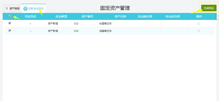 进【固定资产-固定资产管理】,在“变更·生成凭证”页签下,找到同步“资产新增”更新的记录,勾选好,再点右上角“生成凭证”即可