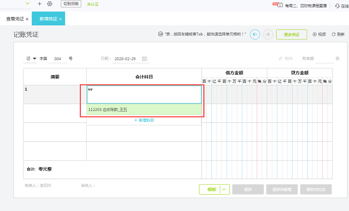 在【总账】-【新增凭证】中,填会计科目的地方直接输入拼音简写,例如“应收账款-王五”,输入【ww】可以快速定位该科目。