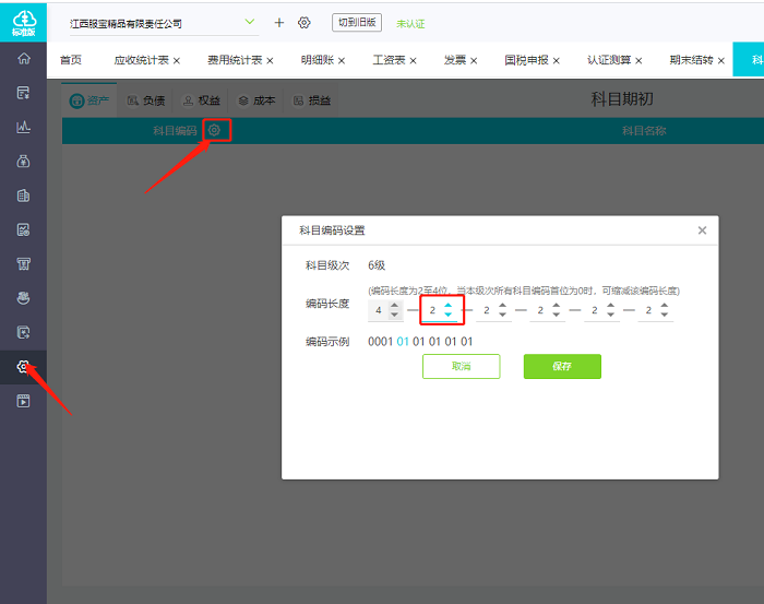 点击【设置】-【科目期初】-左上角【科目编码】旁边的【小齿轮图标】,将第二级科目编码改大即可。