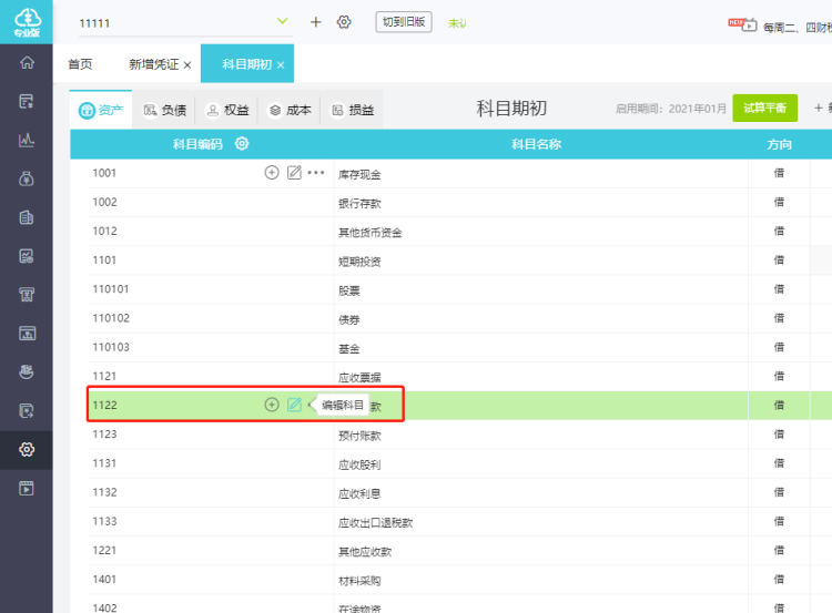 1.点击【设置】-【科目期初】,找准需要挂辅助核算的科目,如【应收账款】,点击【编辑科目】: