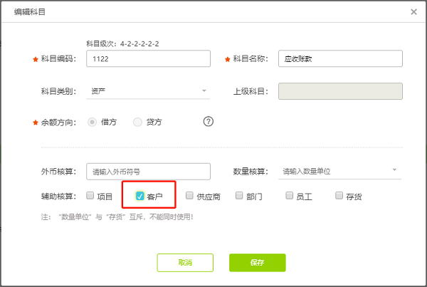 2.勾选客户辅助核算,点击保存:
