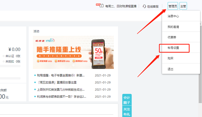 1.登录好会计后,将鼠标放置在账号名称上,点击【账号设置】,进入企业工作台。