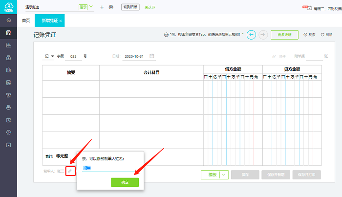 2.将鼠标放置在制单人名称上,点击笔形符号修改制单人名称后,点击确认即可完成新的制单人变更。变更以后再新增凭证时会默认显示新的制单人名称。