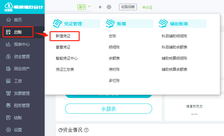 1.登录好会计后,点击左侧的菜单栏【总账】-【新增凭证】。