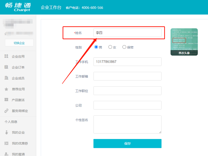 2.点击【编辑个人资料】后,将姓名变更为新的制单人。