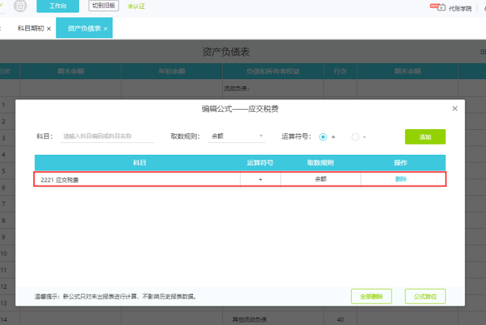 1. 进入【报表中心】-【资产负债表】,点击【应交税费】-【FX】,删除所有明细科目的余额取值,只留一级科目【2221应交税费】的取值: