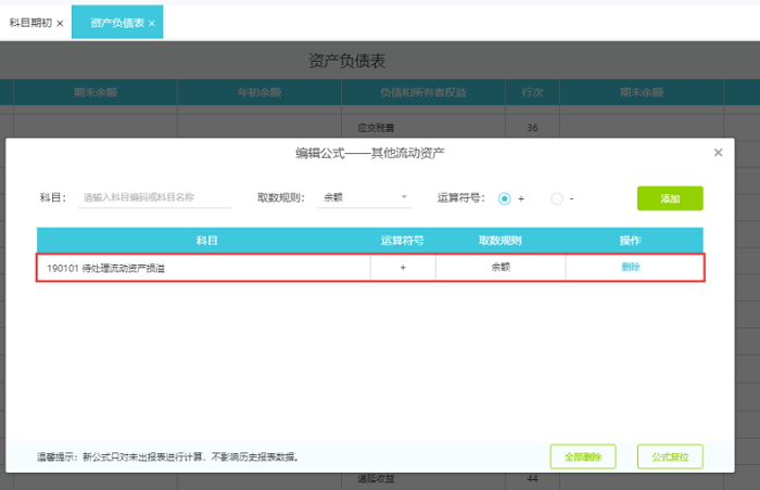 注:若想改回软件默认的取值方式,可分别点击“应交税费”和“其他流动资产”编辑公式框内的公式复位。