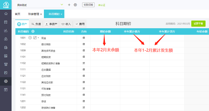 2. 年中建账(如2021年3月份),期初余额按照对应会计科目2021年2月末的余额表填写,本年累计借(贷)方按照余额表内该科目2021年1-2月的累计借(贷)方发生额填写,年初余额系统自动计算,无需填写。