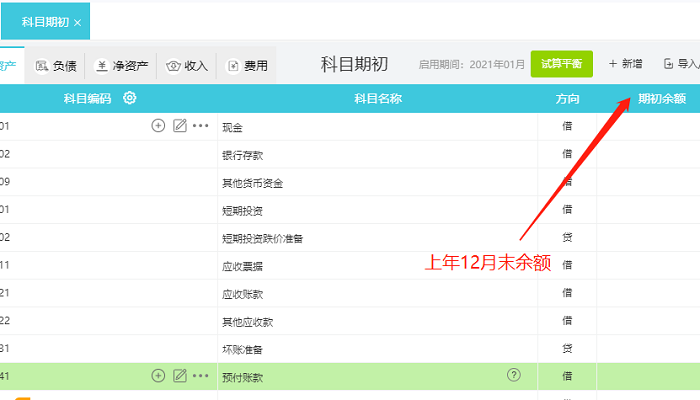 2.若科目余额方向为借方,如应收账款,上期余额表为贷方500元,期初余额应填写“-500”。