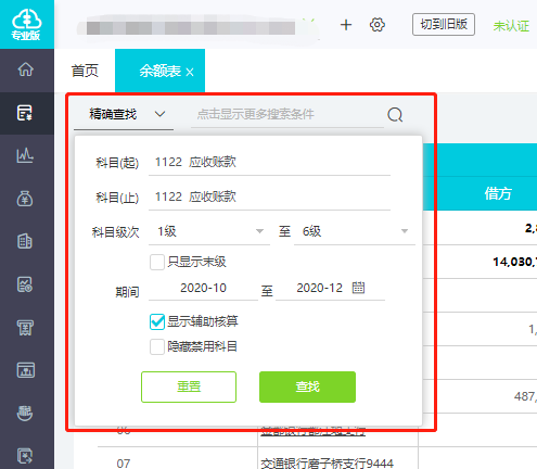 3.根据数据分析需求输入科目范围(应收账款)、时间范围(第四季度)等自定义信息,就可以精确查询财务数据了。