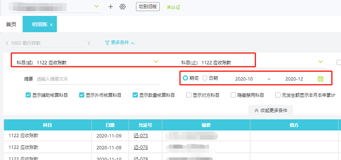 方法一:进入【总账】—【明细账】-【更多条件】,选择需要查询的【科目(起/止)】(应收账款)和【期间】(2020.10-2020.12)