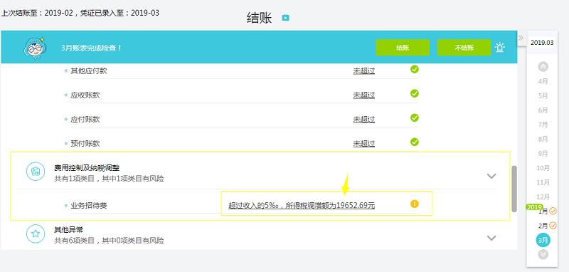 2、 进本期【结账-结账】进行“马上检查”后,系统会自动进行招待费控制及纳税调整提醒如下: