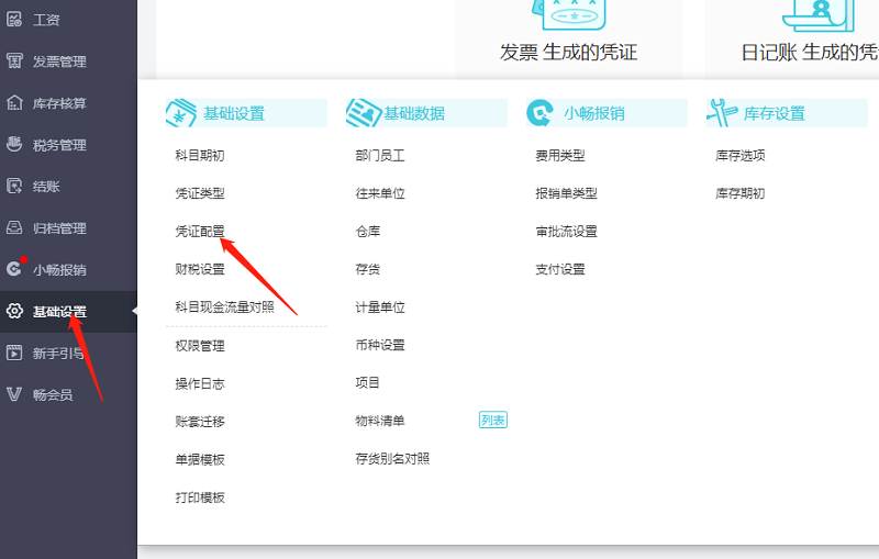 2.报销单凭证规则配置,点击【基础设置】--【凭证配置】