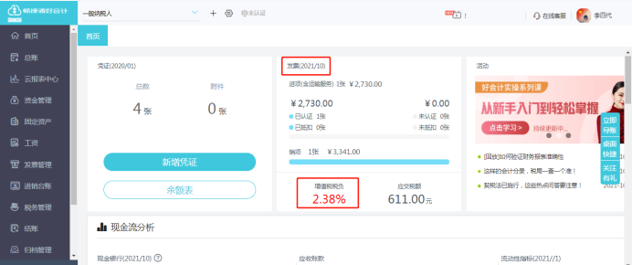 如上图所示,10月份增值税税负率=(10月份发票管理的销项税额-认证的进项税额)÷10月份不含税销售额×100%=(3341-2730)÷25700×100%=2.38%