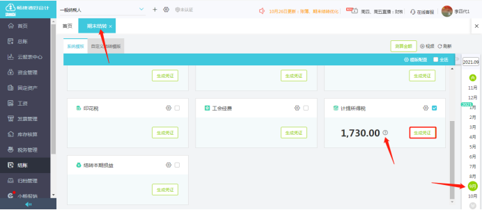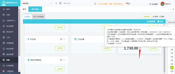 ②可以使用软件的【期末结转】功能去计提享受减免优惠政策之后的企业所得税,系统会智能计算。点击【结账】-【期末结转】-【测算金额】测算所得税,可以点击生成凭证,生成计提所得税的凭证,如果想看具体的数据计算过程,可以点击【计提所得税】结转模板处,数字后方的【?】查看计算过程。