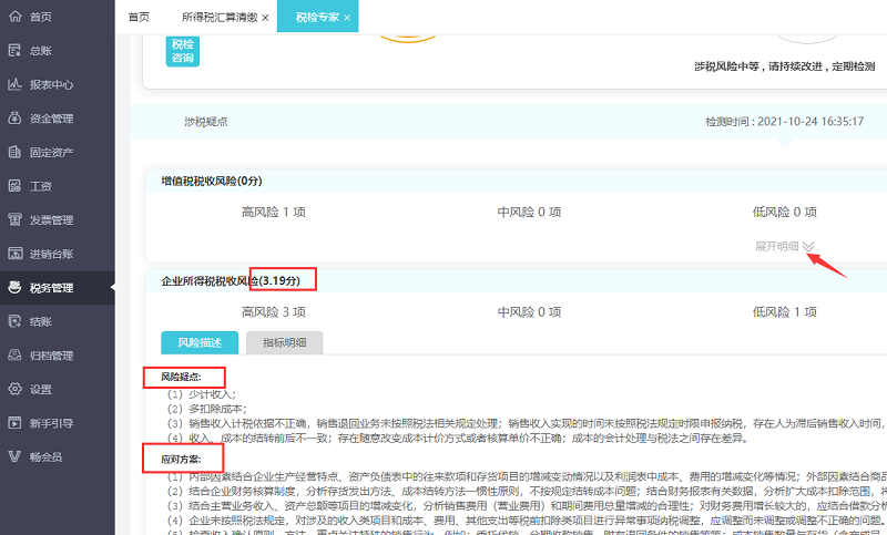 4、系统会自动评判出分数,风险点和对应的应对方案去为排查和解决问题提供参考依据,检测报告也支持下载,方便企业的税务管理。
