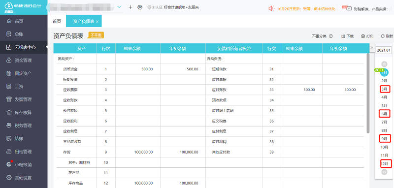 资产负债表季报及年报,资产负债表是时点报表,因为季报和月报是一样的,若要查看某个季度的数据,即直接查看该季度最后月份的数据情况,例如要查询一季度的数据,那么直接看3月份的资产负债表即可,若要查看年报则直接查看12月份报表。