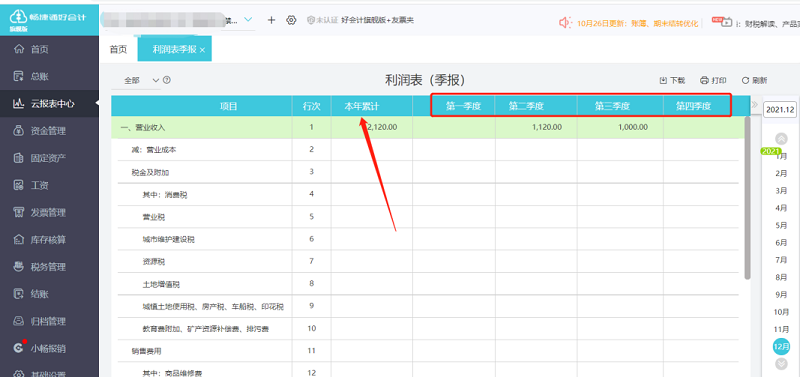 利润表季报及年报,报表中心-利润表季报,可以查看各季度数据,本年累计列即体现利润表年报数据,利润表季报数据取自余额表。