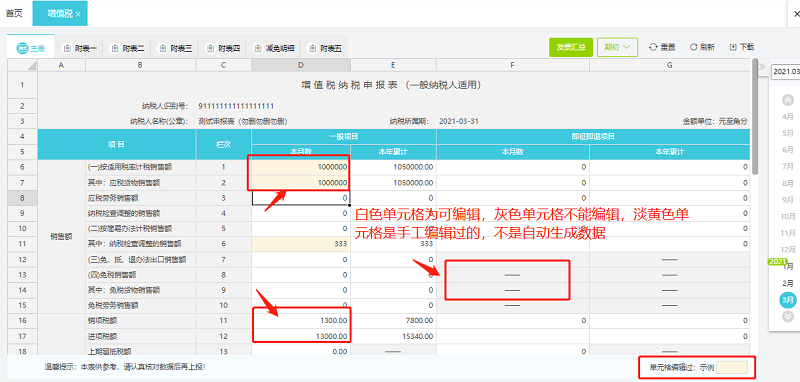 进入增值税申报表界面,在申报表中白色单元格为可编辑数据,灰色单元格不能编辑,淡黄色单元格是手工编辑过的,增值税申报表主表和所有附表都是这样的,如图所示: