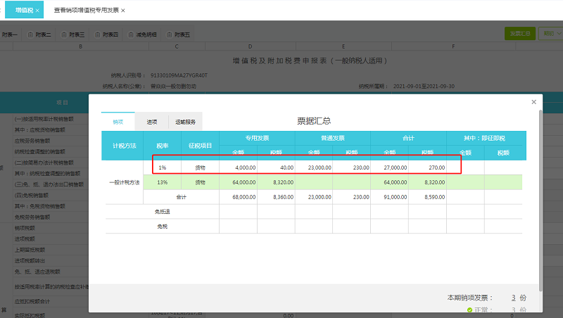 1.增值税申报表“按适用税率计税销售额”=发票管理销项发票“合计金额”-即征即退金额为87000元