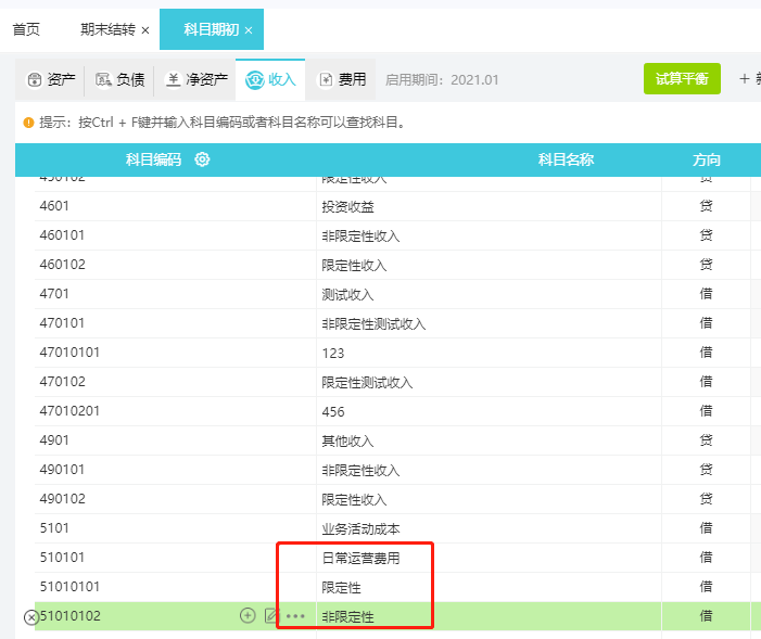 1、进设置-科目期初,找到对应成本、费用类明细科目,在业务活动成本-日常运营费用下添加两个末级科目:限定性和非限定性如下: