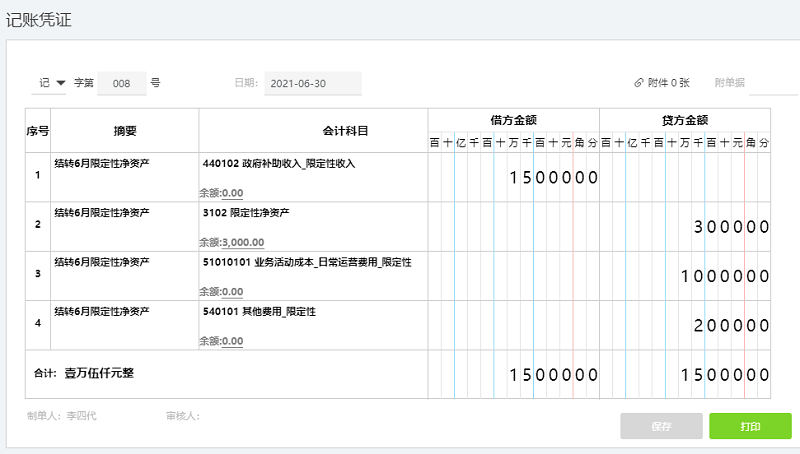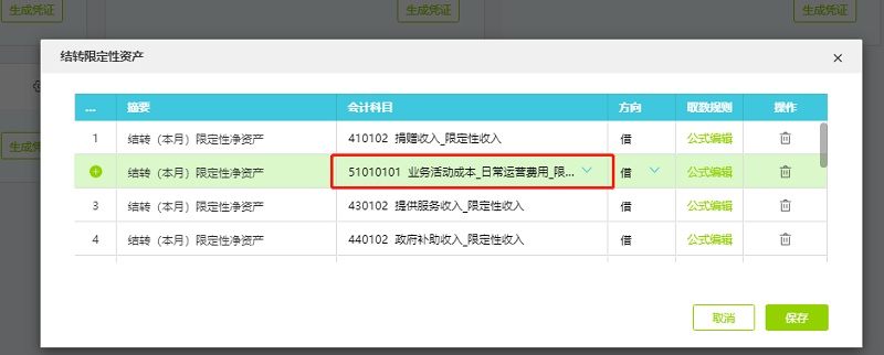 ②需要注意的是该科目会同时出现结转限定性资产及结转非限定性资产的凭证中,此时需要先保存结转限定性资产凭证,而后非限定资产的凭证会自动减去改科目的取数,此时可以保存结转非限定资产凭证。
