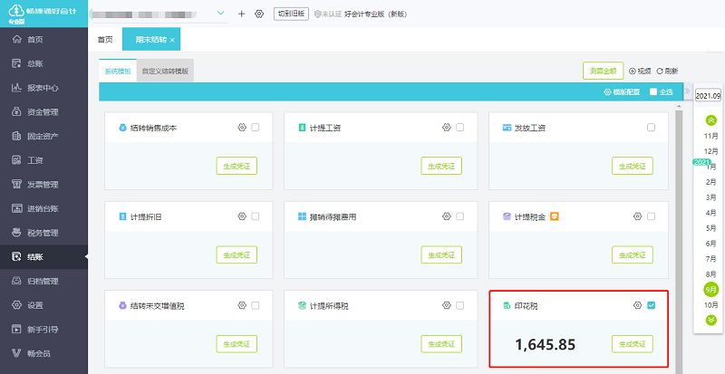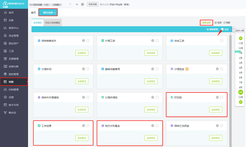 点击【结账】-【期末结转】,右边期间选到3、6、9、12月等月份,以9月为例,勾选【印花税】、【工会经费】和【地方水利基金】模块点击测算金额,或者直接勾选全选然后点击测算金额。