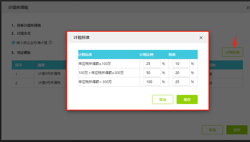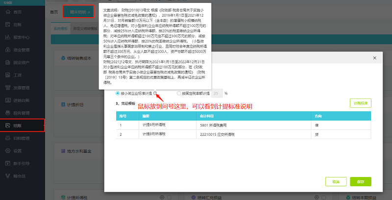 进入计提所得税设置界面,计提方式可勾选按小微企业标准计提或者勾选按固定税率额计提。鼠标放到按小微企业标准计提后面的问号这里,可以看到按小微企业标准计提的标准说明。