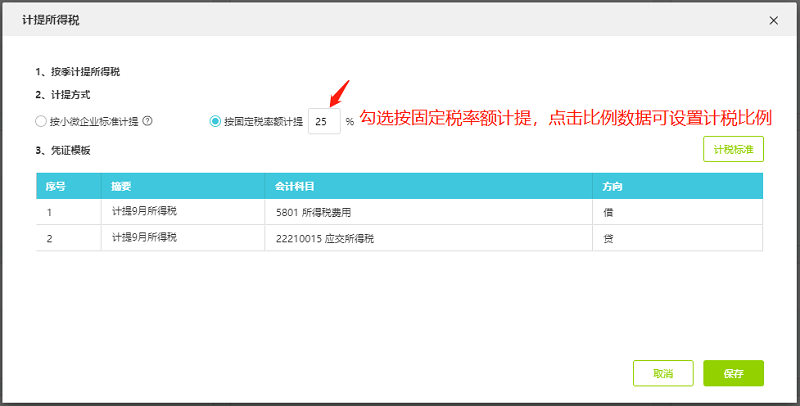 勾选按固定税率额计提,点击比例数据可设置计税比例。