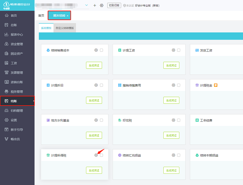 点击【结账】-【期末结转】进入期末结转模块,以9月为例,点击计提所得税模块的设置按钮。
