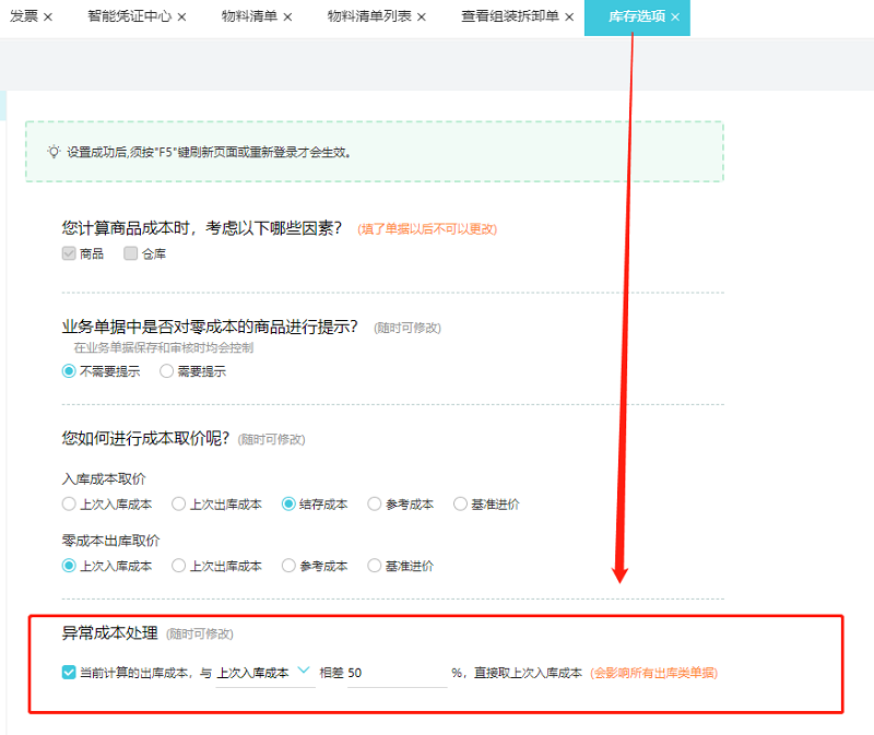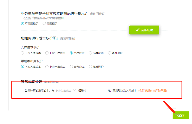 用户在使用好会计旗舰版时,并且开启了库存核算的模块,产品期末有库存,但中途出库单价出现异常的原因是在好会计左边功能栏的【基础设置】-【库存选项】中的勾选了异常成本处理,即【当前计算的出库成本】与【上次入库成本】或者【参考成本】相差比例异常产生的,不要体现这种异常成本差异,取消勾选保存即可.
