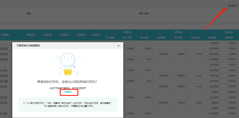 下载打印插件;点击电脑端各种单据历史,比如查看【库存成本明细账】点击打印按钮,系统会弹出让您安装网络打印机。