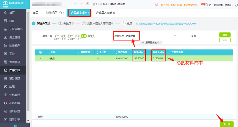 ①点击【库存核算】-【产成品维护】,选择好日期以及产成品;