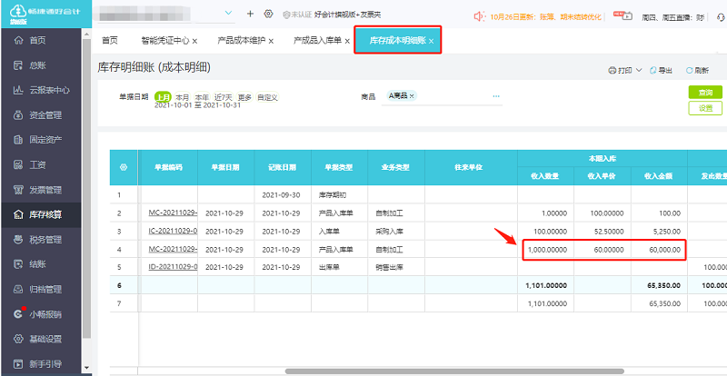 ③根据总金额分摊到入库成本中去:可以点击【库存核算】-【库存成本明细账】查看。