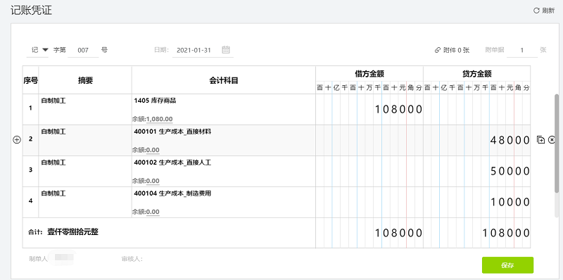 ④【智能凭证中心】-【业务单据】生成产成品入库总成本凭证,需维护好明细。