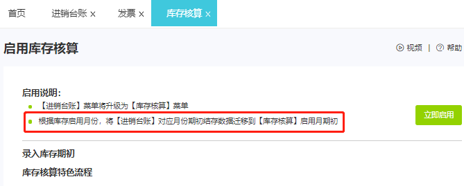 2.点击【基础设置】-【库存核算】,启用库存核算,选择库存启用时间,根据库存启用月份,将【进销台账】对应月份期初结存数据迁移到【库存核算】启用月期初,如图所示: