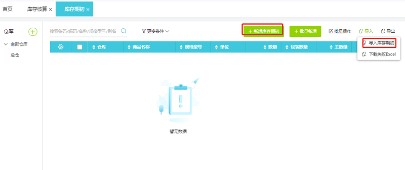 3.点击【基础设置】-【库存期初】,新增库存期初或者导入库存期初,如图所示: