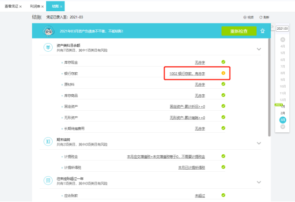 结账时若检查有异常,会用黄色叹号或红色叹号标识出来。黄色叹号标识允许结账,但需人为判断是否重要,是否需要修改。