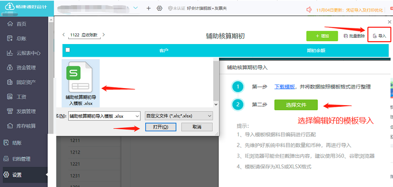 2.3 选择编辑好的辅助核算期初模板导入