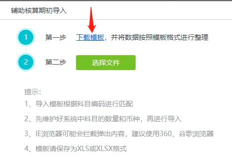 2.2 下载导入模板,维护好对应的辅助核算期初数据
