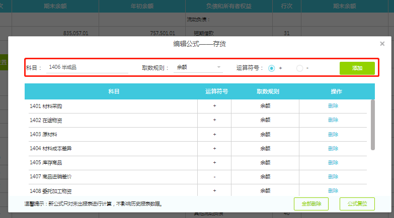 点开“存货”旁边的FX进行公式编辑,输入1406科目、取数规则选择【余额】,运算符号选择【+】,点击右侧的【添加】按钮,报表就按照新的取数规则来取数。