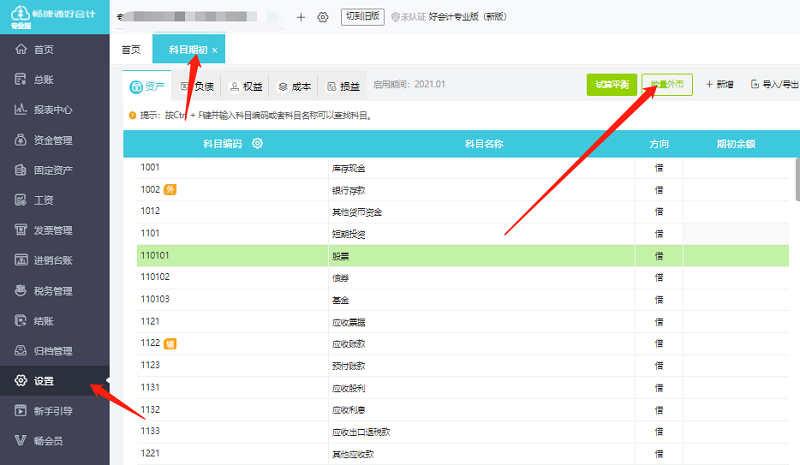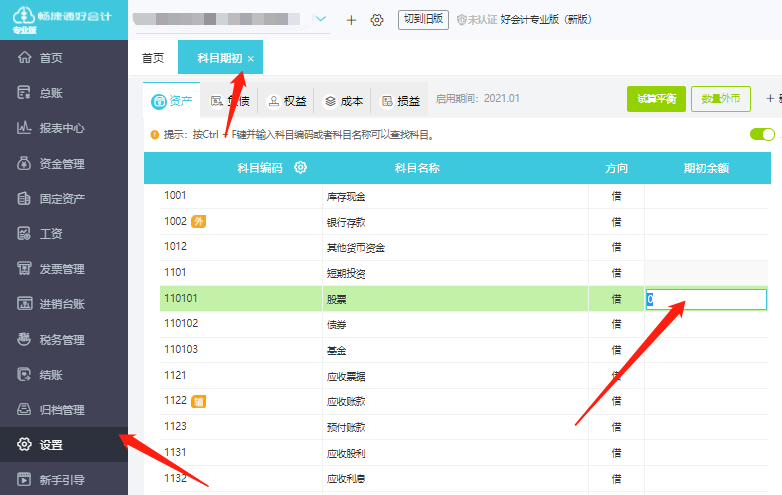 点击【设置】-【科目期初】,直接在明细科目右侧的方框中输入金额即可。