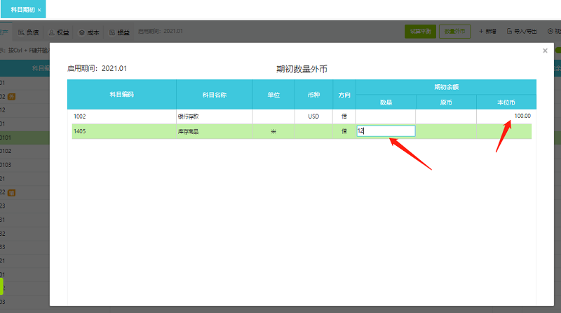 当科目有挂数量或者外币核算的时候,可点击【设置】-【科目期初】,右上角的【数量外币按钮】,在对应的科目下面输入金额即可。
