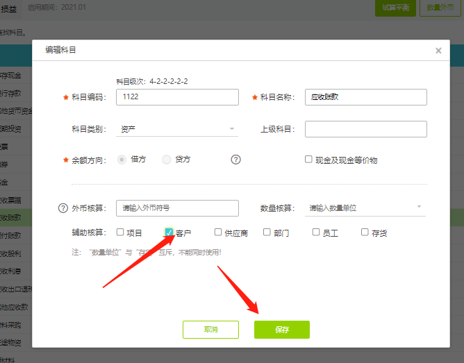 1.辅助核算设置,依次点击【设置】-【科目期初】,再点击科目旁边的【编辑】按钮,在【辅助核算】处勾选到对应要设置的辅助核算项目,例如添加客户辅助核算,如图: