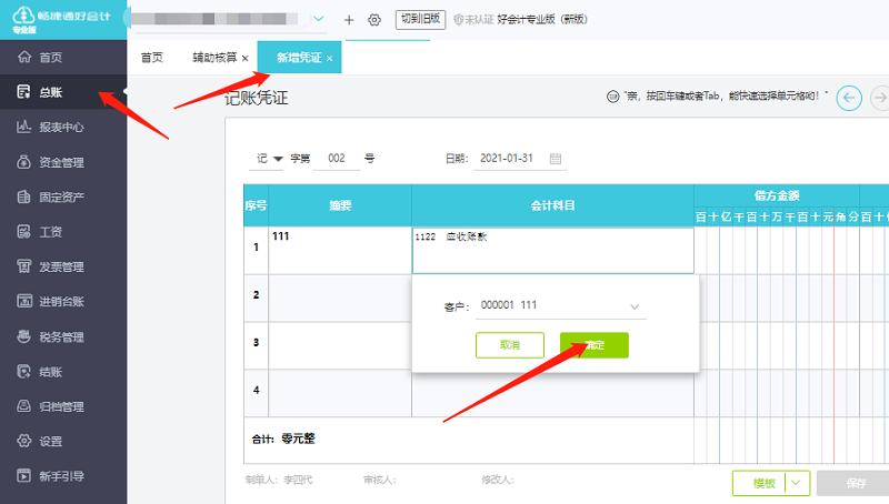 3..填制凭证时,涉及到挂了辅助核算科目的,系统会自动跳出选择框,您选择具体客户后点击【确定】