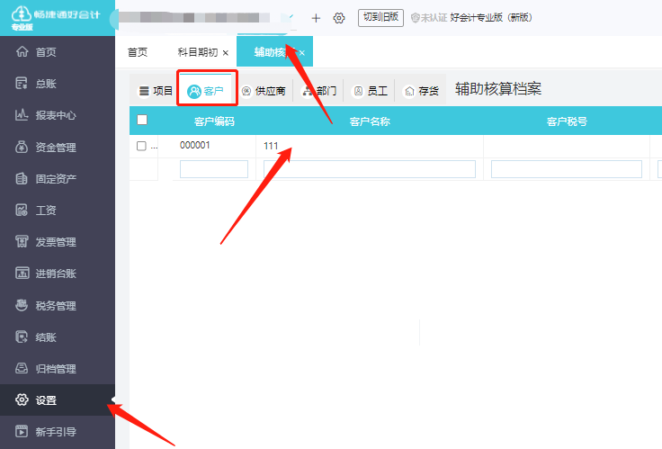2.维护辅助核算档案信息,点击【设置】-【辅助核算】,进入辅助核算档案,把客户信息填写好