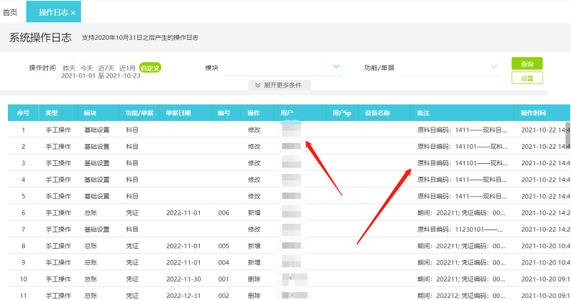 3、点击查询之后,出现各个模块的各个操作,可以查看具体某一个用户进行操作,操作时间,备注就是具体操作的详情
