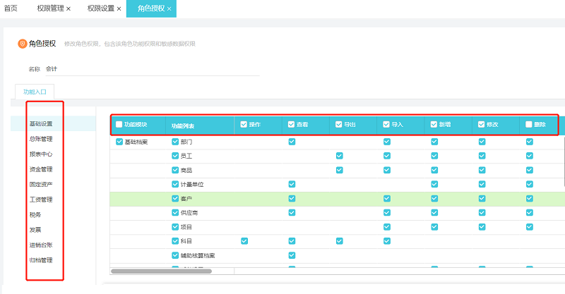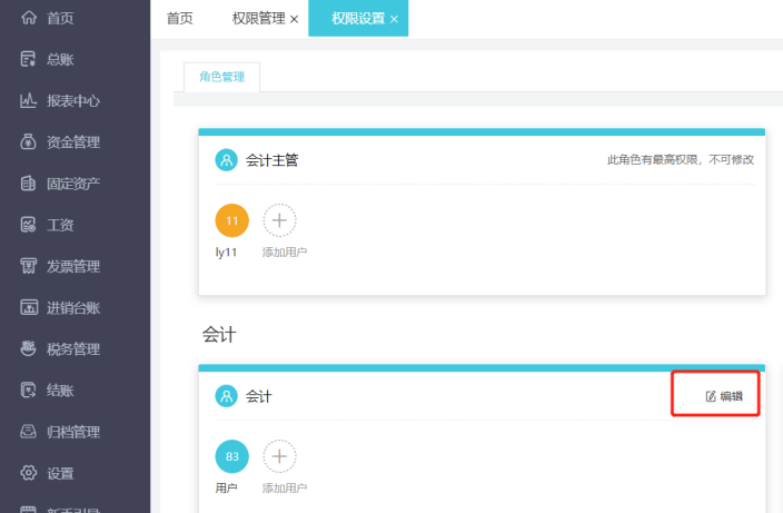 (2)会计主管:会计主管默认有最大权限不允许修改除了给其他的角色授权外