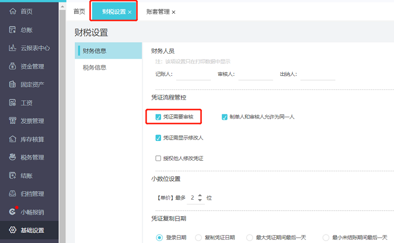 基础设置-财税设置-财务信息,勾选上凭证需要审核,点击保存